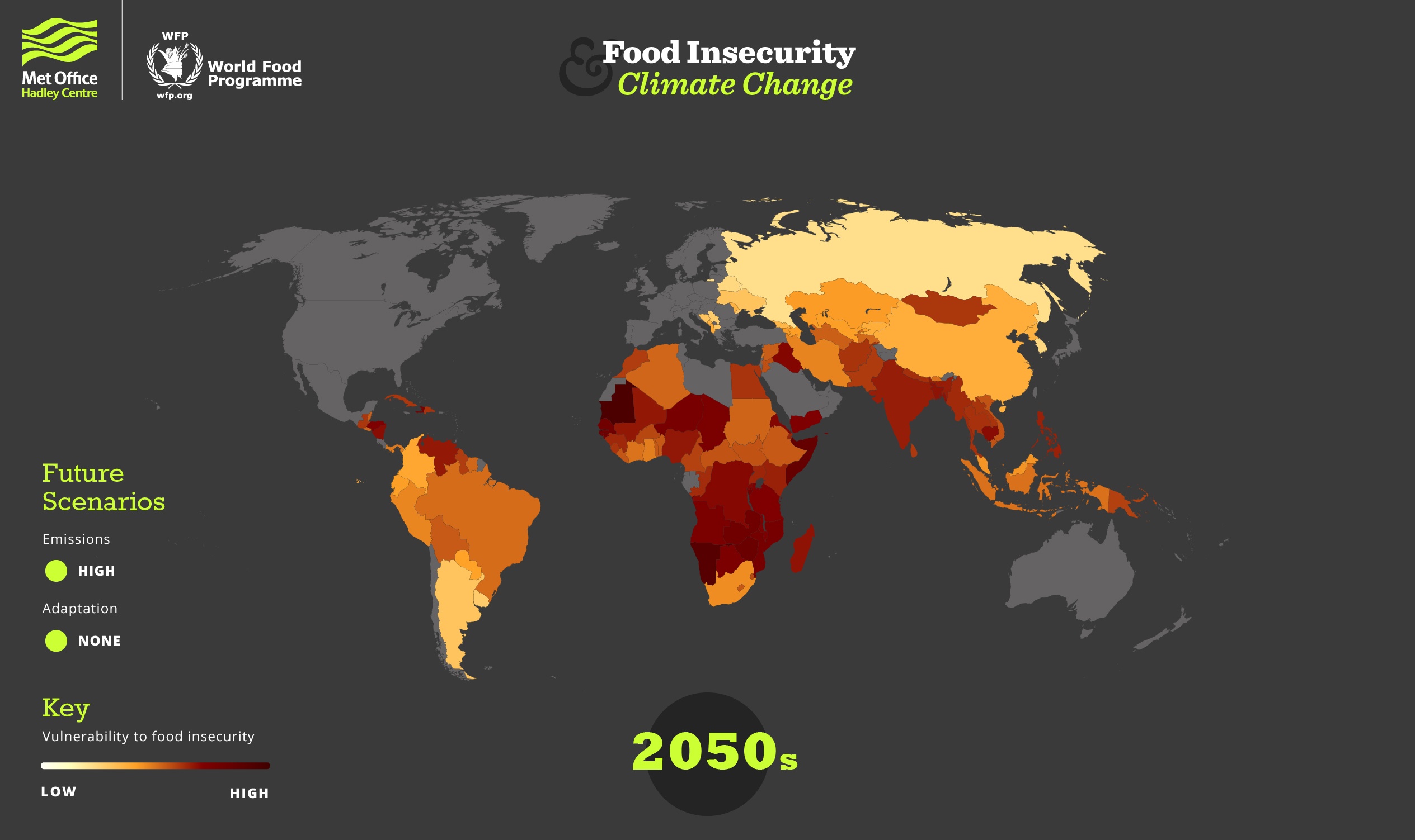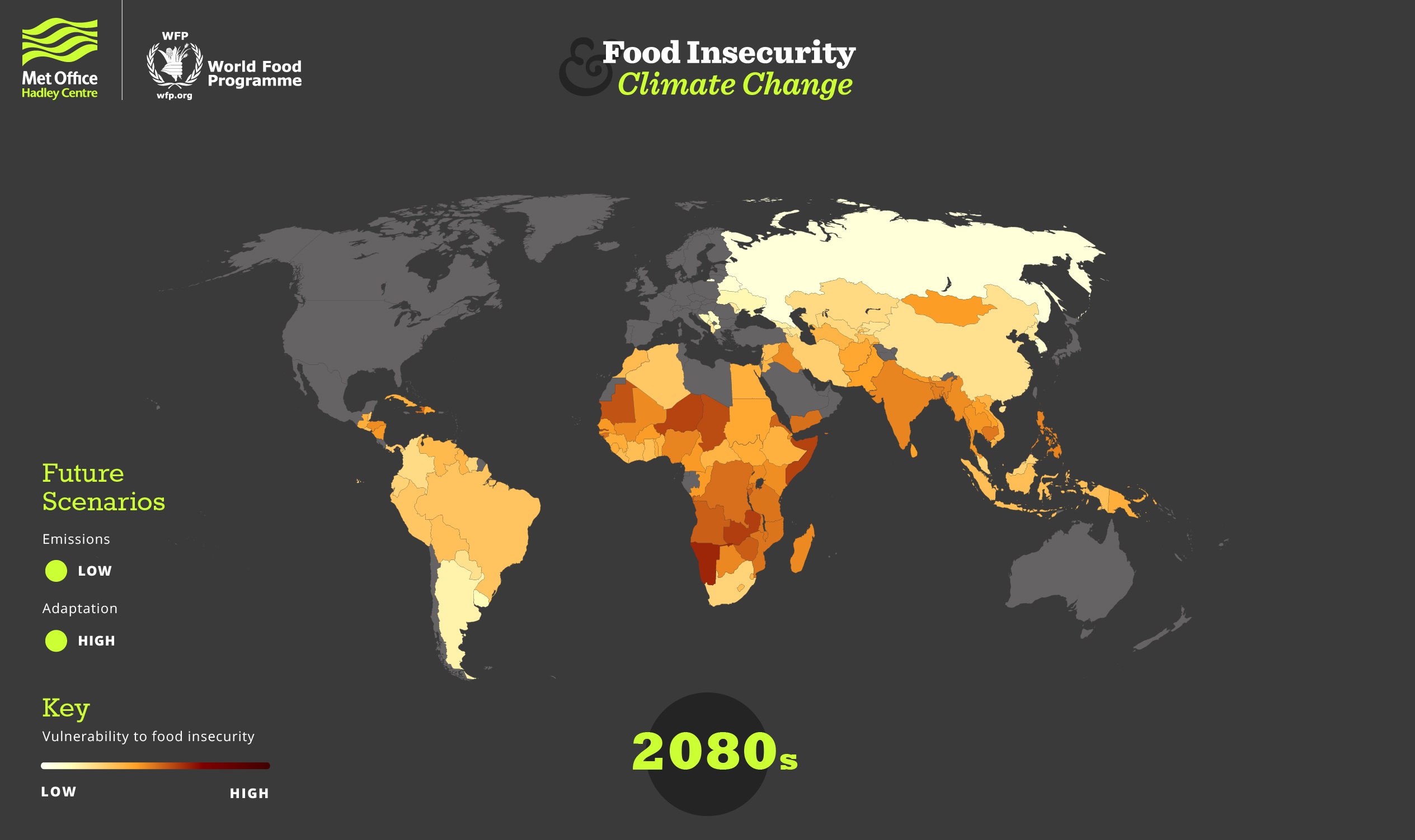 The Met Office Hadley Centre, in cooperation with WFP analysts, has developed the climate and food insecurity index which measures the vulnerability of the food system to climate-related issues in developing and least-developed countries. Under different climate change and adaptation scenarios, the platform developed by the organization enables the evolution of the index in the future to be predicted.